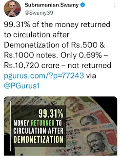 वित्त मंत्रालय नोटबंदी के बाद प्रचलन में धन की वापसी को लेकर भाजपा सांसद सुब्रमण्यम स्वामी द्वारा उठाए गए सवालों का जवाब दे रहा था। इस जवाब से पता चलता है कि 500 और 1000 रुपये के पुराने नोटों पर प्रतिबंध लगाने के बाद 99.31% पैसा प्रचलन में से वापस आ गया था और सिर्फ 0.69% पैसा (10,720 करोड़ रुपये) प्रचलन में नहीं आया।